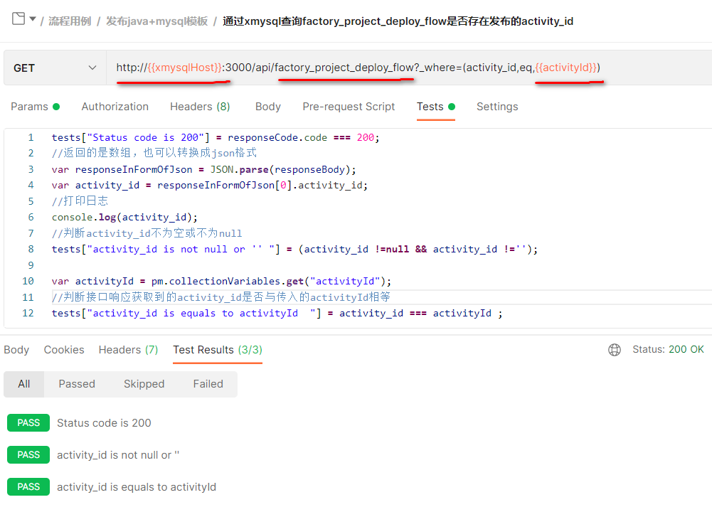 下面以部署应用为例,阐述如何使用Postman+Xmysql自动化测试CloudOS平台服务接口。触发部署应用的接口后,通常需要去做以下几件事来验证是否有成功将应用部署到集群。