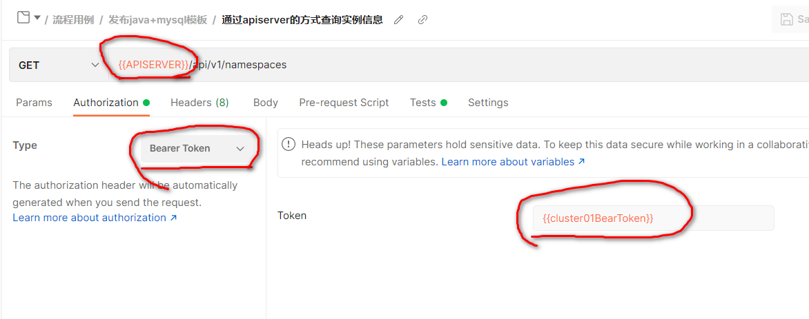 8、在Postman中添加请求,设置集合变量BearerToken和APIServer URL